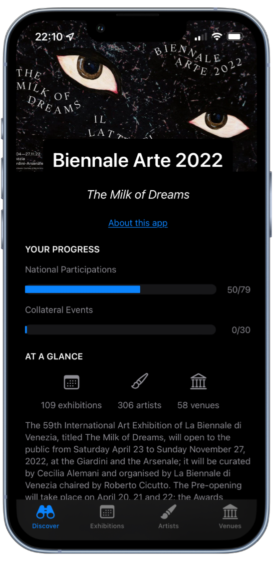 Track the exhibitions you visit. Filter events by type, venue, favourite, visited.